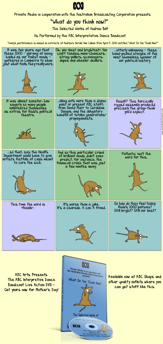 FDotM Interpretive Dance Bandicoot 15 Thursday Apr 2010 Posted by Therese Trouserzoff in Politics in the Pig's Arms ≈ 3 Comments Crikey's wonderful First Dog on the Moon Brings us his ABC Interpretive Dance Bandicoot. DO subscribe if you haven't already. Like Loading...
