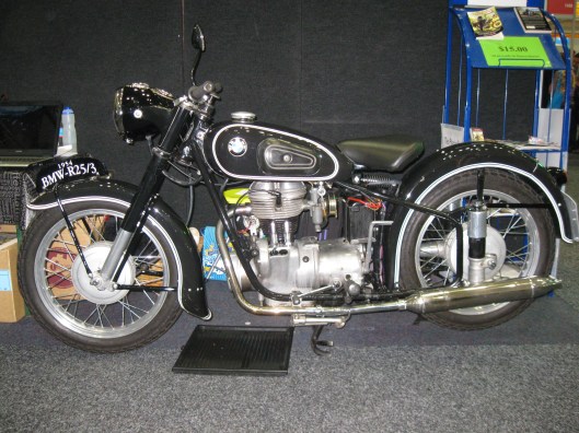The bike was … a 1954 BMW 250 single – beautifully restored.  And it caught my eye because I have one too… not restored and not running since about 1970.  I bought it in that condition in 1980 from a chap who lived a couple of doors up the road from my place (at the time) in Wagga.  Here’s the real deal: