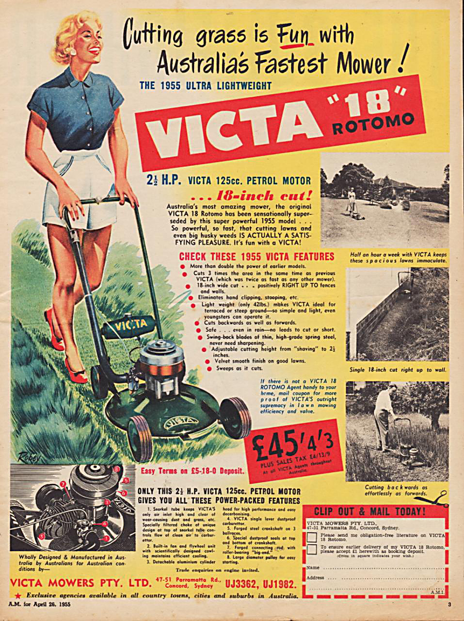http://www.ebay.com.au/itm/VICTA-ROTOMO-RETRO-LAWN-MOWER-AD-1956-original-vintage-AUSTRALIAN-advertising-/281935225831?roken=cUgayN ‘We keep our lawns velvet smooth’ She said.