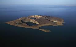 The shore recedes and far ahead I see the Central Island, which is actually an active volcano, emitting small puffs of white-grey vapor into the cloudless sky.