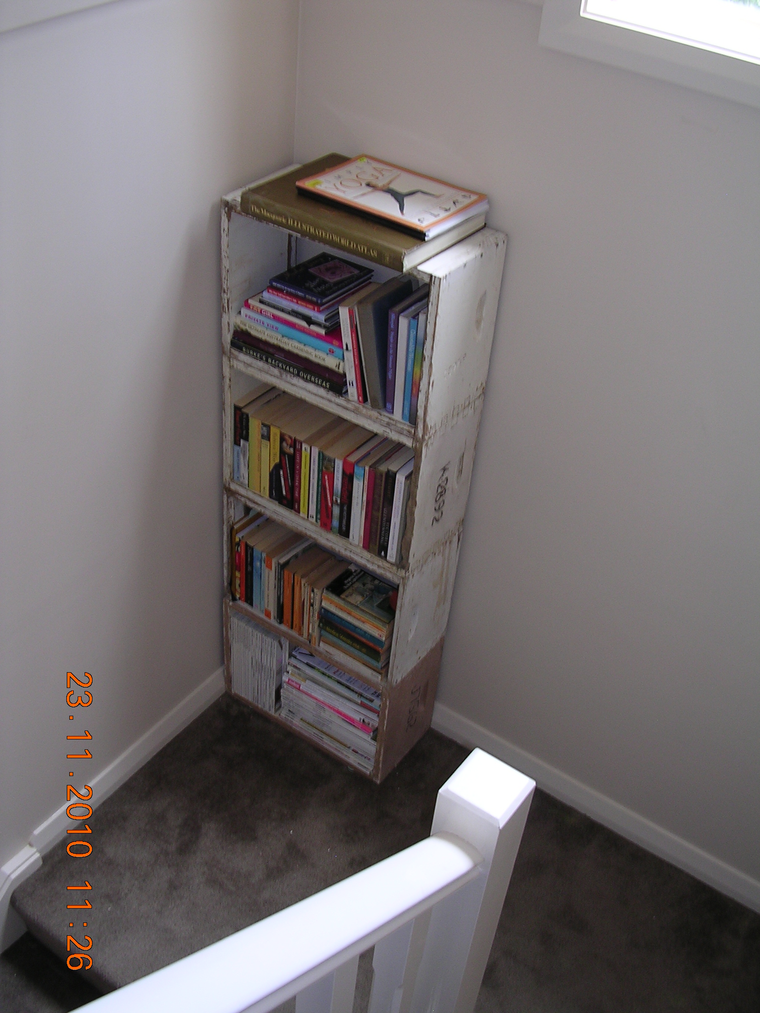 The wandering book searcher had in the meantime surveyed the rag-tag of books on the shelving. He cast his eyes over the titles, holding his head askew this way and that way trying to read as much as was still visible on the torn covers. He munched approvingly on his rotating burger which was now almost eaten to its core.