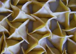 Place a walnut size amount on each wonton wrapper and fold appropriately (triangle or parcel)..