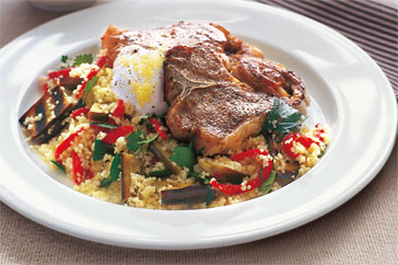 To serve, cut lamb at an angle and arrange on serving plate.  Add vegies and sauce and serve at once.
