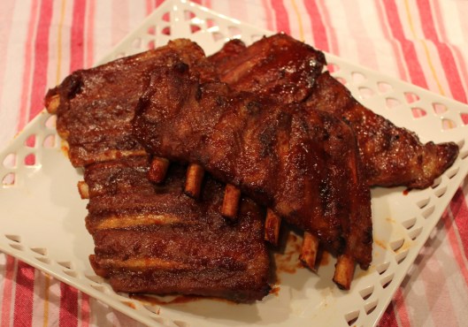 Place ribs in a large baking dish and pop into medium hot oven to cook about ¾ through.  Add nothing, just the ribs.  The purpose is actually to cook out any fat.  Take pieces out and cut into sections of 4 or 5 ribs each.  Clean out the baking dish and arrange rib pieces side by side.   Mix the following together in a bowl: